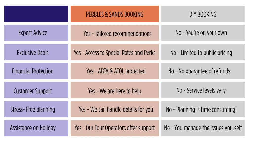 Choosing Pebbles & Sands over independent booking means enjoying a stress-free experience with expert assistance. Here’s how we compare: